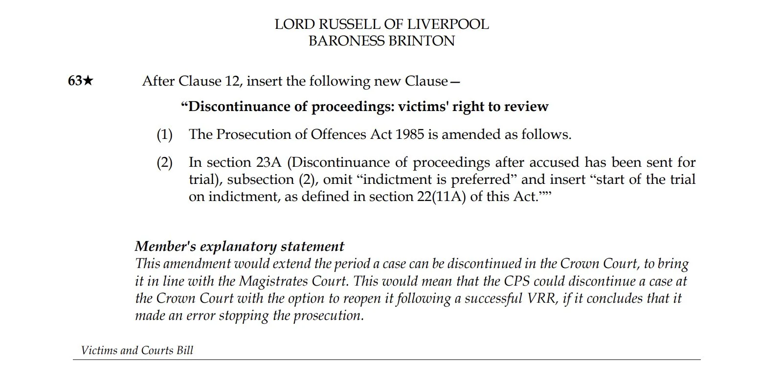 The amendment would help ensure that victims are not shut out of the Victims’ Right to Review when a case is discontinued late in the Crown Court process. By extending the point at which proceedings can be stopped to the formal start of the trial, it brings the Crown Court into line with the Magistrates’ Court and allows the CPS to reconsider, and where appropriate reopen, a case if a decision to discontinue is found to be wrong.